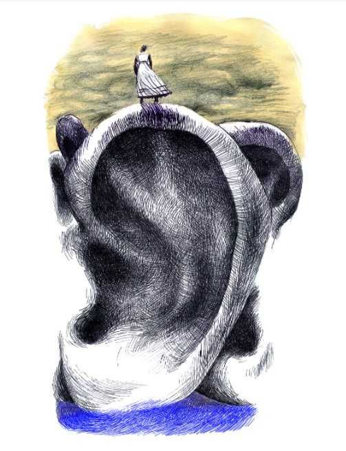 Svetinovo besedno potovanje vseskozi spremljajo tudi Stepančičeve ilustracije. Te se, sorodno kot Svetinov tekst, navezujejo tudi na nekatere elemente izven dotičnega literarnega sveta. Navezujejo se med drugim na že omenjeni Alici ̶ na Alico Anja Klara, za katero sicer sklepamo, da je v zaboj s časopisi padla iz našega časa in prostora, spominja že z izbiro oblačil. Hkrati pa Stepančič mestoma nadaljuje tudi likovno pripoved iz drugih literarnih svetov istega ustvarjalnega tandema, predvsem iz Ušesa sveta, zbirke kratkih zgodb, ki je prav tako z različnih plati naslavljala posameznikov položaj v družbi. A če smo bili iz zbirk kratkih zgodb vajeni, da sta tekst in ilustracija, pa čeprav sta nastajala vsak zase in bi lahko stala tudi sama, iz strani v stran skupaj v prepletu sotvorila pomen, tokrat tekst vendarle prevzema glavno vlogo, nenazadnje je pred nami roman(ček).