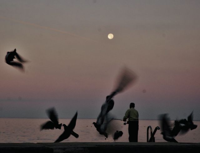So pa se, kjer ni bilo avtov, a zadosti nesnage, na tleh zbirale množice velikih, rejenih galebov, ki ne klonijo ne v ujmi in ne v vročini, strašnih galebov, ki se ruvajo za drobtine in si, dobesedno, kljuvajo oči. Dva, posebej debela in posebej čez les, sta priskakljala, če so to bili skokci, do nje in se ji bliskovito javila v višini brade, s kljunoma že skoraj na kremni nagradi. Stekla je stran, v redko senco macesnov, in ptiča ji, k sreči presita, nista sledila.