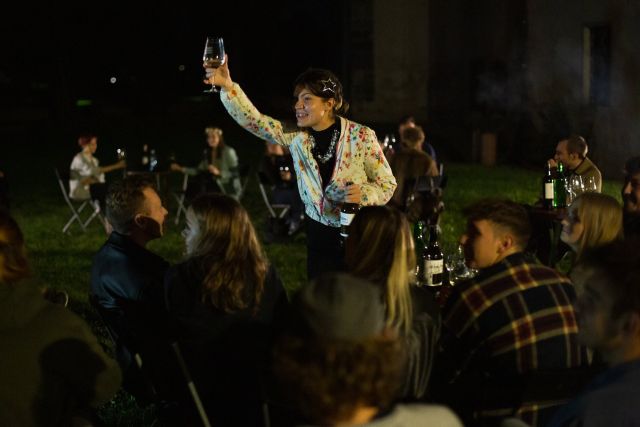 Večer je zaključila polnočna predstava Kdaj pride Ličinka? Performans je predstavil (ne)kulturo pitja vina, ki je v naši družbi pogostejša od kulture, ki jo spodbuja tudi sam festival. Tematsko se je gledališka stvaritev ukvarjala s procesom uničevanja žlahtne kapljice in njene pretvorbe v sredstvo za opitost, vse to pa je bilo zavito v zgodbo o srednješolski obletnici, kjer bivši sošolci pričakujejo razredničarko (Beckettovega Godota). Prizorišče je bil Sončni park, ovit v ambientalne lučke, napise. Mize in stoli so prinašali realističen vpogled v dogajanje samo, saj so igralci skozi usmerjeno improvizacijo poskušali gledalcu, ki je bil prav tako del predstave, približati idejo, ki so jo predstavljali.